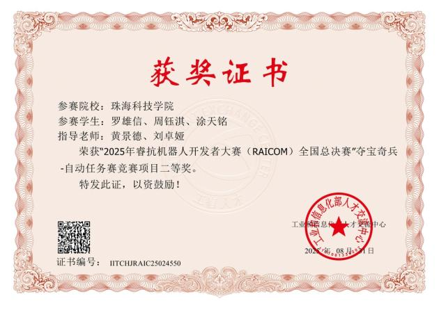 睿抗机器人开发者大赛(RAICOM)由工业和信息化部人才交流中心主办。在2025 年睿抗机器人开发者大赛(RAICOM)中,我校参赛队伍在精度、效率、创新等多维度评审中表现突出,荣获国家级一等奖1 项、二等奖4 项、三等奖1 项,省级二等奖6 项。
