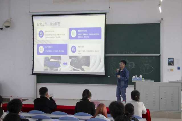 在校友分享环节,我院往届毕业生陈子杰以“从校园到职场”为主题,讲述了自己从母校到奔图的成长之路,分享自己通过社团活动探索兴趣、实习实践验证方向、挖掘技能优势匹配职业的经历,为学弟学妹们提供了极具参考性的职业规划思路。
